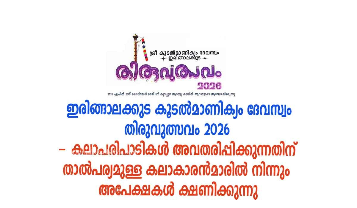 ശ്രീ കൂടൽമാണിക്യം ക്ഷേത്രത്തിലെ 2026 വർഷത്തെ തിരുവുത്സവം ഏപ്രിൽ 28 മുതൽ മെയ് 8 വരെ ദേശീയ സംഗീത നൃത്ത വാദ്യോത്സവമായി ആഘോഷിക്കുന്നു. തിരുവുത്സവത്തോടനുബന്ധിച്ച് കലാപരിപാടികൾ അവതരിപ്പിക്കുന്നതിന് താൽപര്യമുള്ള കലാകാരൻമാരിൽ നിന്നും ദേവസ്വം അപേക്ഷകൾ ക്ഷണിക്കുന്നു. നിശ്ചിത ഫോറത്തിലുള്ള അപേക്ഷകൾ 2026 ജനുവരി 27ന് 5.00 മണിക്ക് മുമ്പായി നേരിട്ടോ, ഇ-മെയിൽ വഴിയോ കൂടൽമാണിക്യം ദേവ ഓഫീസിൽ സമർപ്പിക്കേണ്ടതാണ്. അപേക്ഷ ഫോറം ദേവസ്വം ഓഫീസിൽ നിന്ന് നേരിട്ടും, വെബ്സൈറ്റിൽ നിന്നും ഡൗൺലോഡ് ചെയ്തു എടുക്കാവുന്നതാണ്. കൂടുതൽ വിവരങ്ങൾക്ക് താഴെ പറയുന്ന നമ്പറുകളിൽ ബന്ധപ്പെടാവുന്നതാണ്. 2006718 9497561204, 9539220511 ഇമെയിൽ contact@koodalmanikyam.com വെബ്സൈറ്റ് www.koodalmanikyam.com